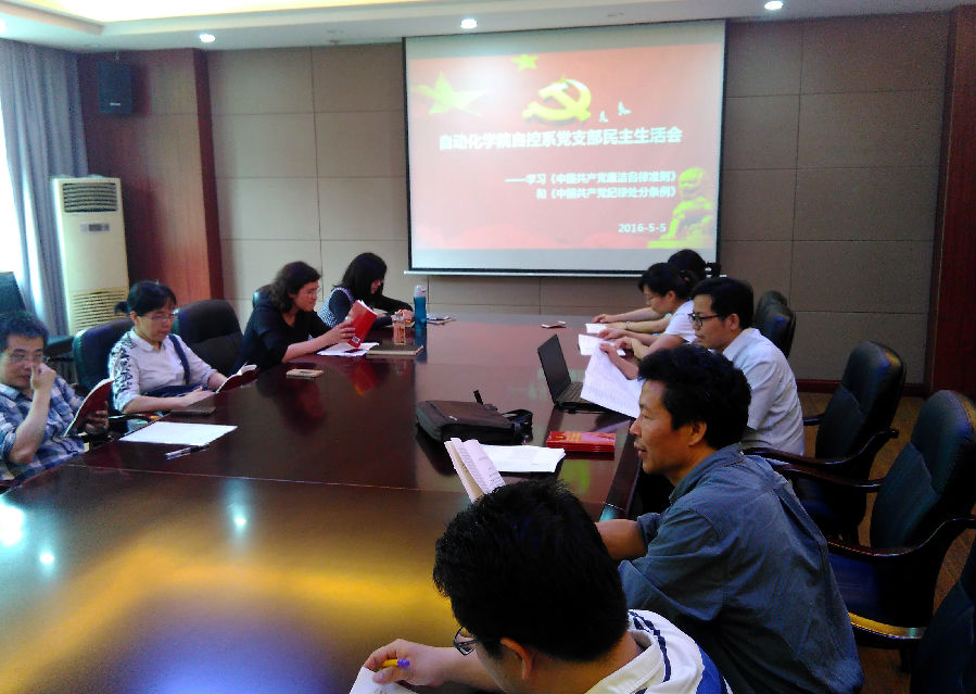 2016年5月5日下午,自动化系党支部在信息楼316会议室召开了“支部主题党日”组织生活会,集中学习了学校“两学一做”教育实施方案、《中国共产党廉洁自律准则》和《中国共产党纪律处分条例》。