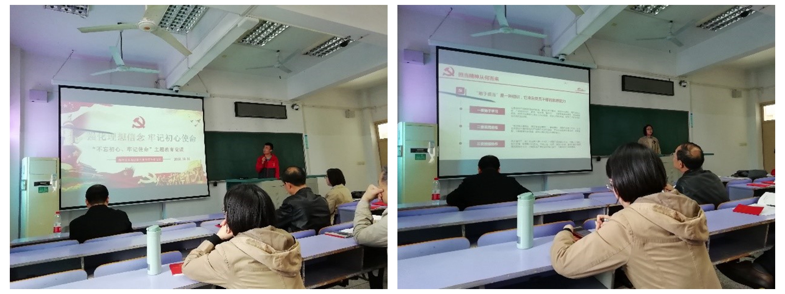 首先,在测控系及研究所党支部书记晋芳同志的组织下,全体党员重温入党誓词,教师党员代表袁艳同志和学生党员代表朱春源同志诵读党章第三章,带领大家学习“党的中央组织”,并缴纳了2019年10月的党费。