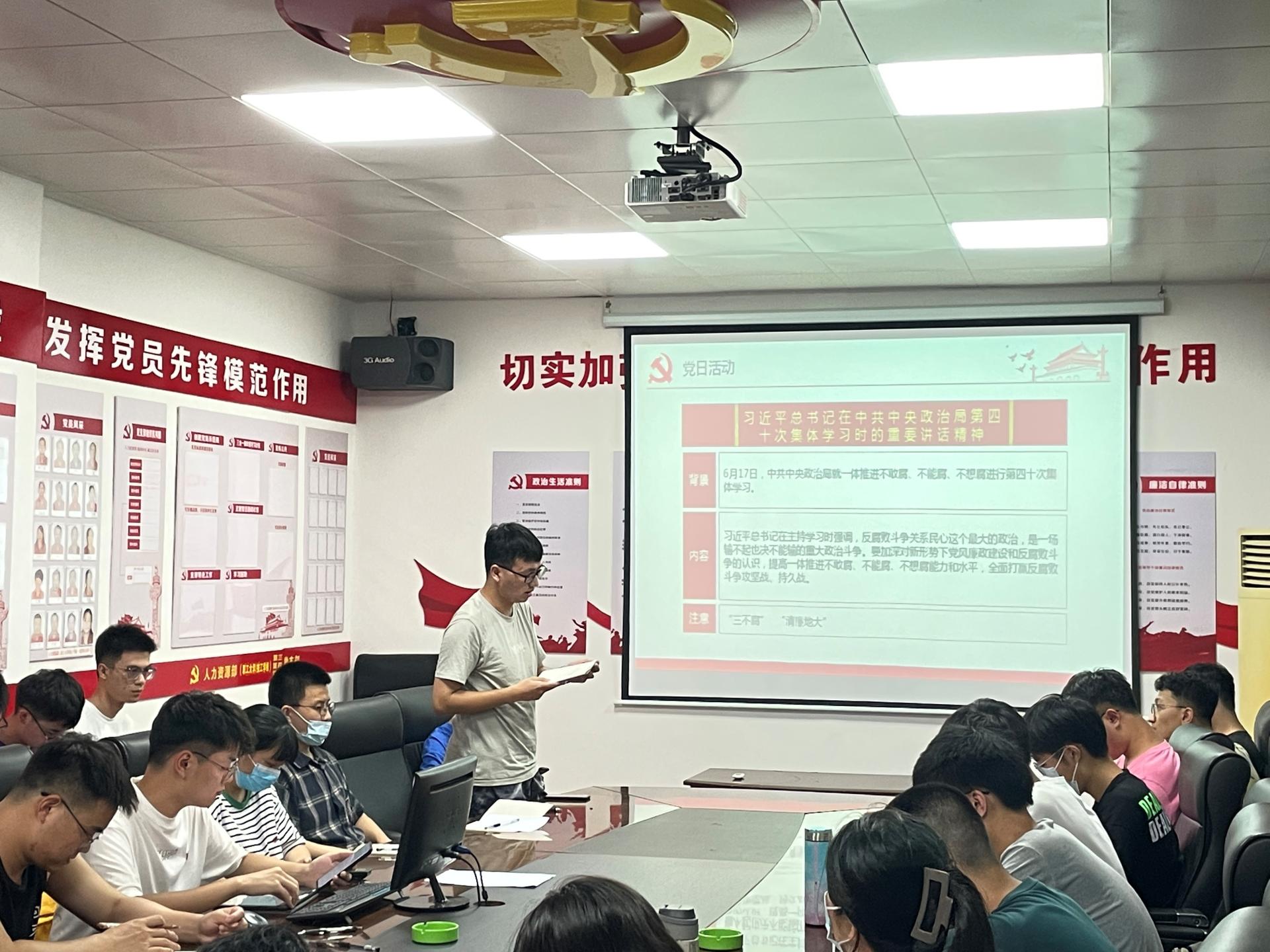 主题党日活动包括重温入党誓词、庆祝建党101周年和香港回归25周年、学习习近平总书记在中共中央政治局第四十次集体学习时的重要讲话精神、湖北省第十二次党代会精神、学校《党员干部下基层察民情解民忧暖民心实践活动实施方案》以及党费缴纳的相关规定等内容。党员同志们都深有感触,学生党员李云龙同志谈到:“香港的前途和国家的前途紧密联系在一起,香港不仅会从国家快速发展和繁荣富强中获得发展,还会从国家生机勃勃的进取精神当中,获取自强不息的发奋思路”。闫浩鹏、刘诗雨、陈力子、范豪辉几位学生党员分别就学习内容交流了自己的学习心得与感想。党员同志们都认为应学习优秀共产党人为国家付出一切的精神,努力学习,争取为国家建设出一份力。