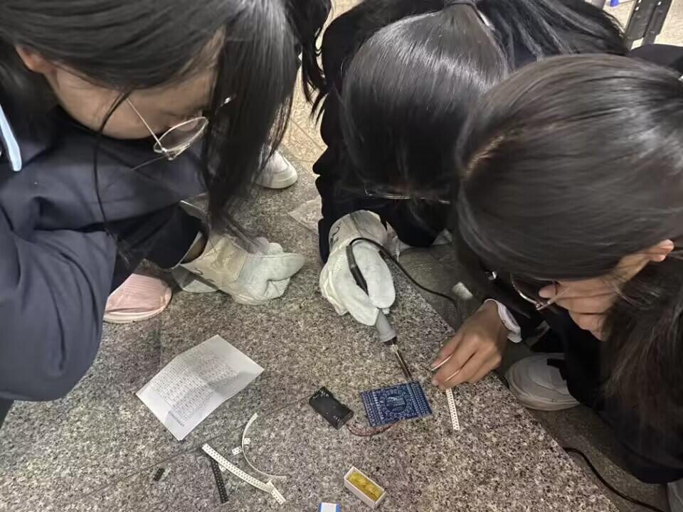 活动中,志愿者与研支团成员带领孩子们分组学习自动化实验基础——PCB焊接。在志愿者的帮助下,孩子们戴上厚手套,一手拿焊丝一手拿焊枪进行PCB焊接操作。这种寓教于乐的方式,激发了孩子们探索的兴趣。