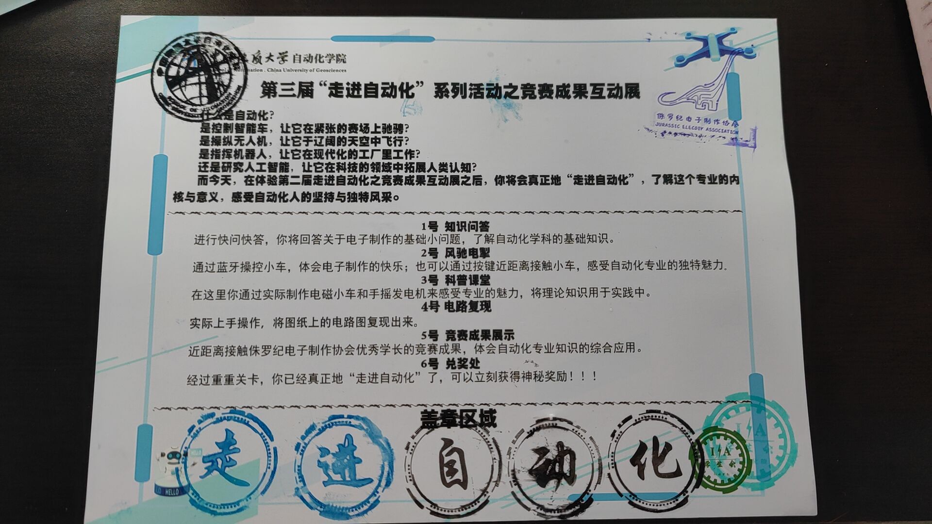 第五个摊位为竞赛成果展示,同学们向优秀学长请教问题,交流竞赛经验和心得,接触侏罗纪电子制作协会优秀学长的优秀作品,更进一步丰富了自动化专业创新实践知识;最后一个摊位为兑奖处,通过集齐的“走进自动化”印章,同学们参与了抽奖环节,更有幸运的同学抽取到了蓝牙音响、耳机、U盘等奖品。活动最后,beat365英国官方网站文艺部成员和全体人员进行了合影留念,本次活动圆满结束!