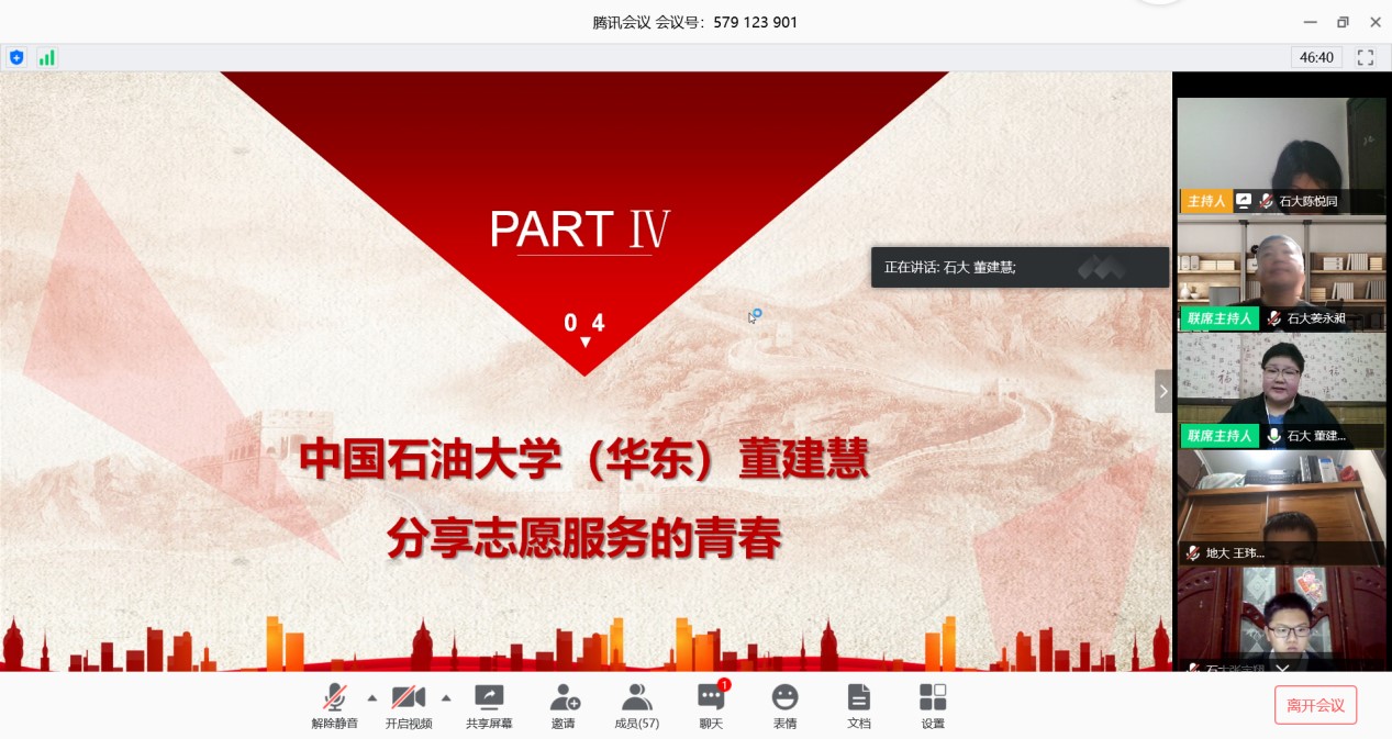 中国石油大学(华东)地球科学与技术学院党委副书记徐永涛围绕此次疫情彰显的制度优势,政局稳定,以人民为中心集中力量办大事,社会保障公平,人类命运共同体等进行讲述,他还分析了目前国外的局势,充分展现了中国在面对此次疫情所做出的巨大贡献,展现了党和国家的底线思维和忧患意识。他说:“在对于一个事物或者人,如果想要树立信念和信任,一开始要从理智上认同它,从而在感情上产生热爱,最后形成信仰”。他激励同学们要相信党和政府,要在奋斗中谱写大写的青春,让青春梦想在民族复兴的伟大梦想里尽情的绽放。