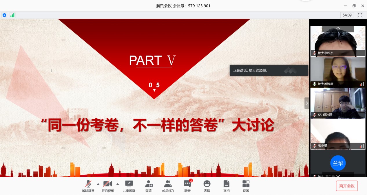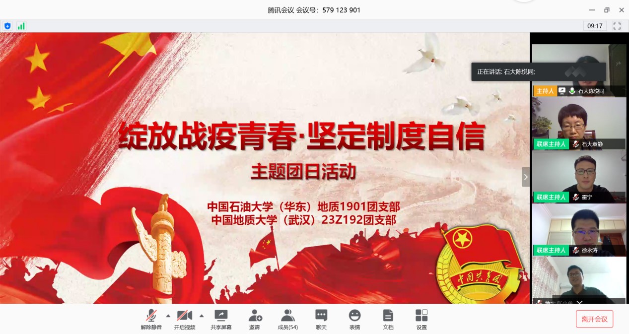 围绕这次疫情大考中国展现出来的制度优势和当代青年责任担当,beat365英国官方网站(武汉)和中国石油大学(华东)多名同学发表了自己的看法。地大的徐源徽同学说到:“这次疫情对于广大青年而言是一次特殊的‘成人礼’,我们用行动证明:新时代的中国青年是好样的,是堪当大任的。”地大的孔思栋谈到:”我们每个人也要用青春去践行五四精神,让青春在为祖国,为人民,为民族,为人类的奉献中焕发出更加绚丽的光彩。” 地大的张宇一说:“在党和政府的领导下,复工复产正在有序推进,勤劳勇敢的中国人民一定能战胜疫情。”石大的刘璐璐说:“我敬畏那些在疫情中奉献的青年,我敬佩他们勇于担当,不畏艰险。”最后,石大地质1901的班长柴君林和地大23Z192班的团支书周汶昊做表态发言,周汶昊说到:“我们青年人将不负建功立业的人生际遇,不负天降大任与斯人的时代使命,不负党的期望、人民的期待、民族的重托,用努力奋斗的青春,使自己成长为一个有理想、有本领、有担当的时代新人。我们青年要在为人民服务中茁壮成长,在艰苦奋斗中砥砺意志品质,在实践中增长工作本领,让青春在党和人民最需要的地方绽放绚丽之花。”