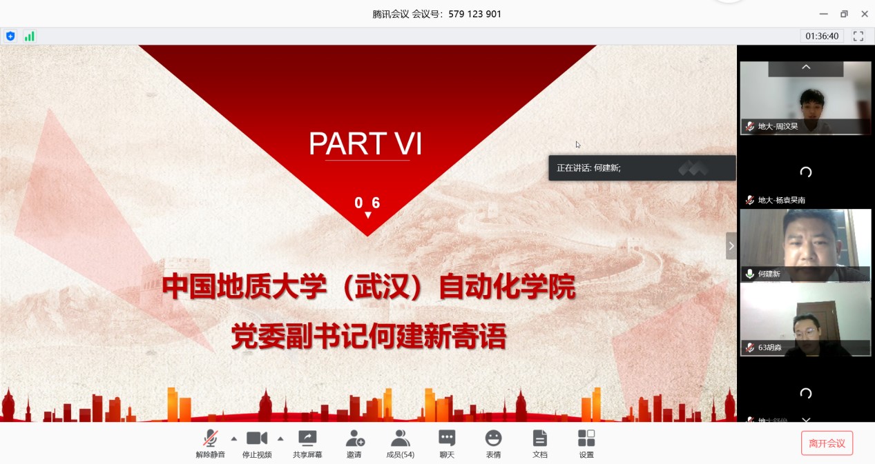 (通讯员:黄兰华 周汶昊)为学习贯彻习近平总书记关于疫情防控工作的系列重要讲话和指示批示精神,认真贯彻落实习近平总书记给北京大学援鄂医疗队全体“90后”党员的回信精神,5月2日晚19:30,beat365英国官方网站(武汉)自动化类专业23Z192班与中国石油大学(华东)地质类1901班“云”端相聚,联合开展以“绽放战疫青春,坚定制度自信”为主题的线上团会。本次团会出席的嘉宾有beat365英国官方网站(武汉)beat365英国官方网站党委副书记何建新,团委副书记许彦,2019级辅导员黄兰华,中国石油大学(华东)地球科学与技术学院党委副书记徐永涛,团委书记霍宁宁,团委副书记姜永昶,地质类1901班主任袁静教授,山东大学齐鲁医院内分泌科护士长郑会珍。本次主题团会坚定青年学生制度自信,激励学生练就过硬本领,投身强国伟业,始终保持艰苦奋斗的前进姿态,在实现中华民族伟大复兴中国梦的新长征路上奋勇搏击。