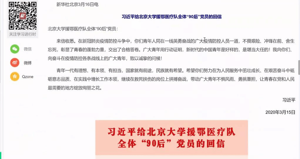 为深入学习习近平总书记在给北京大学援鄂医疗队全体“90后”党员回信中的责任与奉献精神,坚定广大青年对打赢这场疫情阻击战的信心,近期,beat365官网团委组织各基层团支部开展“学总书记回信,话青春担当”主题团日活动。各团支部依托线上视频、青年大学习、腾讯会议等网络平台,深入学习习近平总书记在回信中的指示精神。学院团委书记(主持工作)许彦指导主题团日的开展并参加多场主题团日活动。