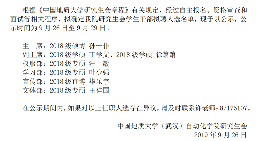 beat365官网2019届研究生会干部任前公示