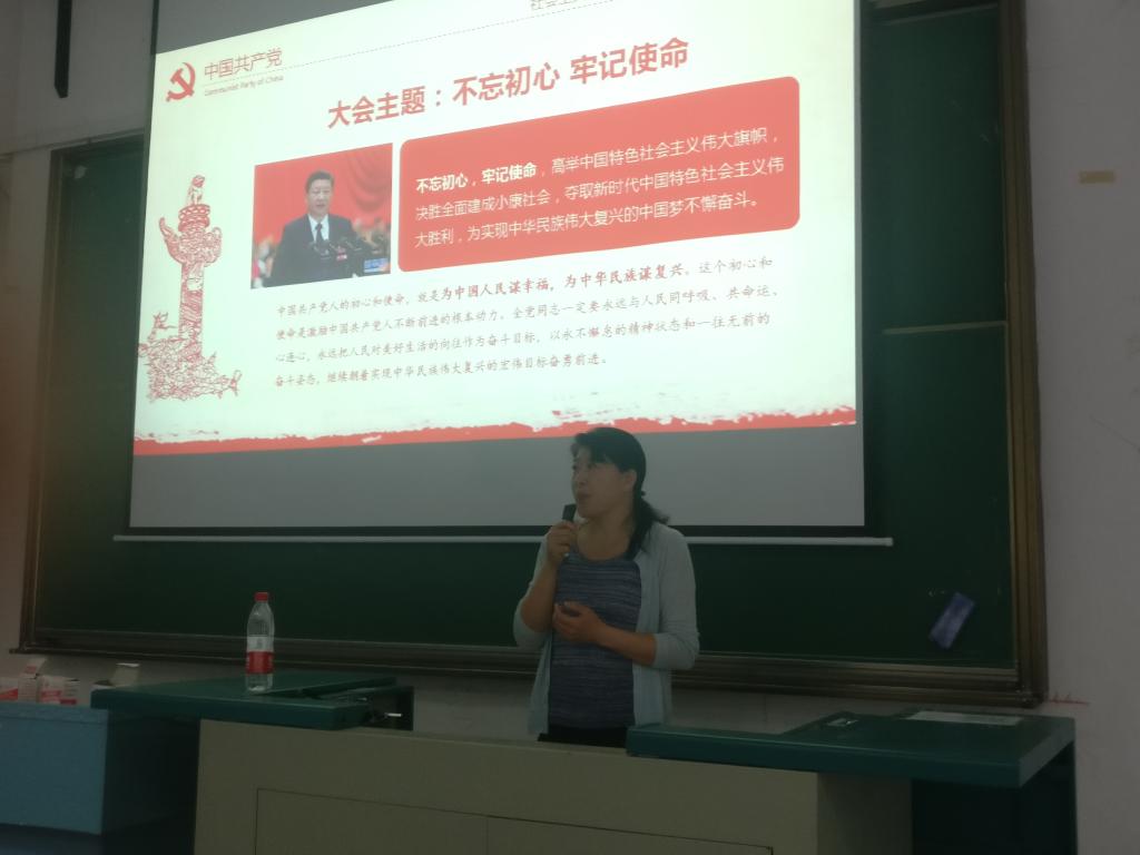 (通讯员 栾淑惠)2018年4月20日下午四点,beat365英国官方网站分党校第八期入党积极分子培训班党课第七讲在教三楼208举行。本次党课的主题是“学习贯彻党的十九大精神”,主讲人是机电学院党委书记王海花老师。