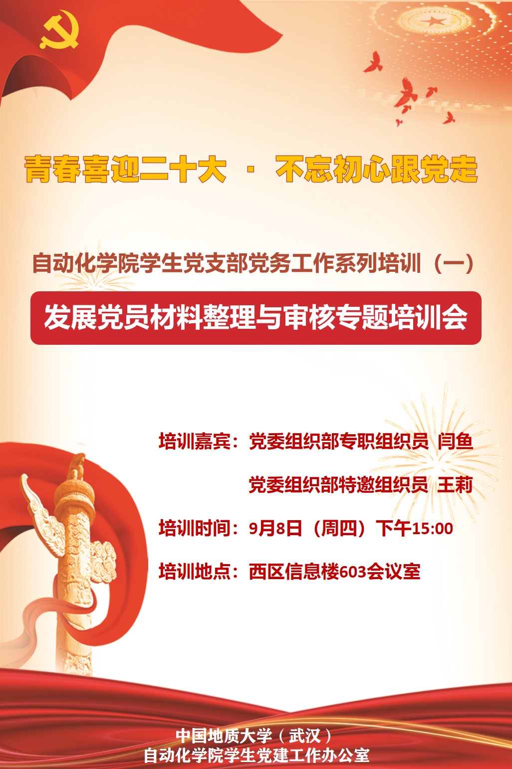 (通讯员:黄兰华、陈文虎、李兵权)为进一步规范发展党员流程,提升党员发展质量和水平。9月8日,beat365英国官方网站在信息楼603会议室开展了学生党支部党务工作专题培训的第一期——《发展党员材料整理与审核专题》,学院学生党建工作办公室特别邀请党委组织部专职组织员闫鱼老师、党委组织部特邀组织员王莉老师莅临现场指导,学院全体学生党支部支委参加本次专题培训。专题培训会由学院学生党建工作办公室主任黄兰华老师主持。