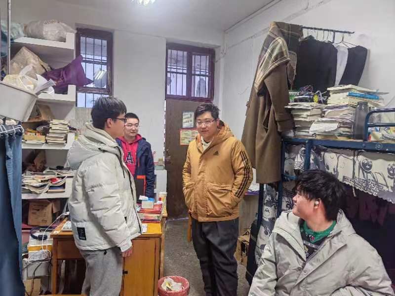 春来日暖,冰雪消融,万象更新。根据学校有关要求和工作安排,为进一步了解学院学生思想、学业及生活动态,保障新学期各项工作开展,营造良好学风,2月26日晚,beat365英国官方网站党委书记朱荆萨、院长曹卫华带领党政班子,各教职工党支部书记、各年级班主任以及全体辅导员先后走访了学院全体本研学生宿舍和实验室,进一步了解学生近期思想动态和相关需求,叮嘱同学们为新学期做好准备。