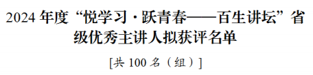 据悉,“悦学习·跃青春—百生讲坛”活动是共青团湖北省委员会、湖北省学生联合会主办的青年思想引领工作品牌。全省各高校经“班(团支部)、院、校”逐级联动层层遴选推荐,最终评选出100名省级主讲人。