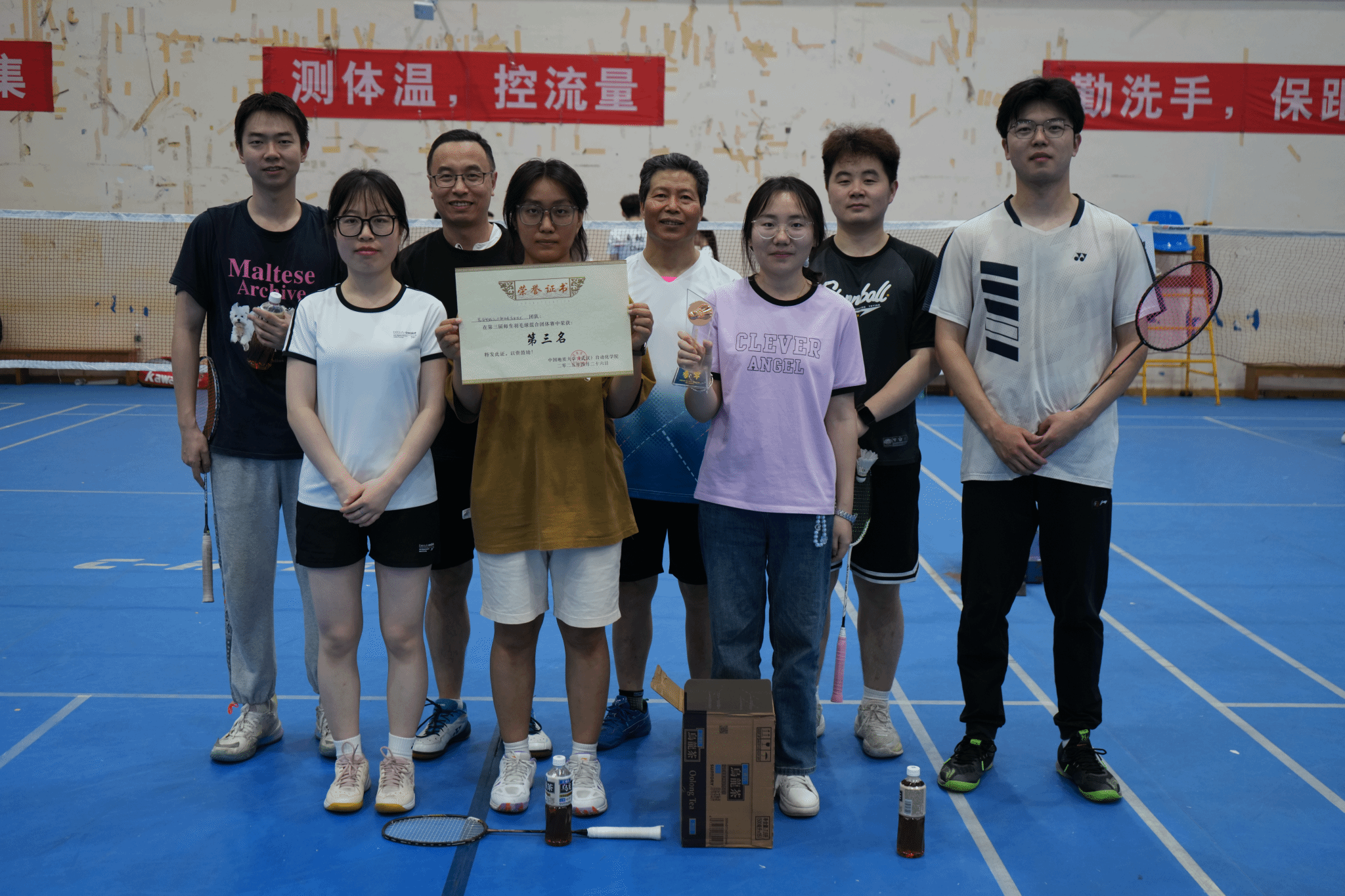闭幕式上,王广君老师为获奖团队颁奖并与获奖团队成员合影留念。副院长刘振焘致闭幕辞,他充分肯定了本次导学团队羽毛球赛对于丰富校园文化生活和促进导学关系共融所具有的重要意义,同时殷切期望更多师生能够走出实验室、走向操场,在享受运动乐趣、锻炼身体的同时,将 “比学赶超” 的精神带到日常的学习工作中,为学院的建设与发展作出新的更大贡献。