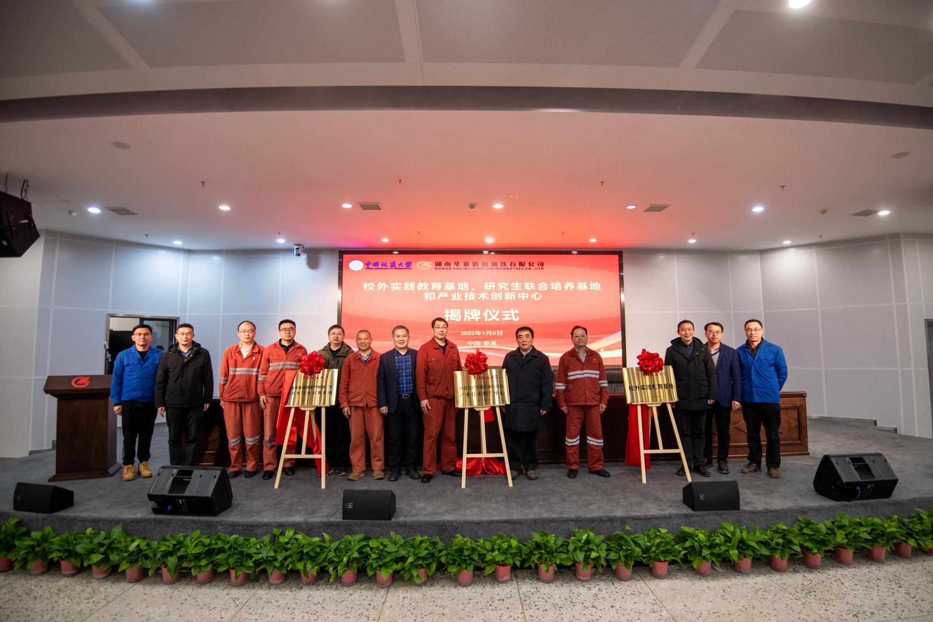 2022年1月5日,我校与湖南华菱涟源钢铁有限公司(以下简称涟钢)共同建设的beat365英国官方网站(武汉)“校外实践教育基地”“研究生联合培养基地”和“产业技术创新中心”三个基地揭牌仪式,在湖南娄底涟钢举行。涟钢副总经理邓必荣,副总工程师、企划部部长黄兆军等负责人,我校副校长赖旭龙,未来技术学院院长吴敏、beat365英国官方网站院长曹卫华等负责人,以及正在涟钢生产实习的师生共同参加了揭牌仪式。曹卫华主持揭牌仪式。