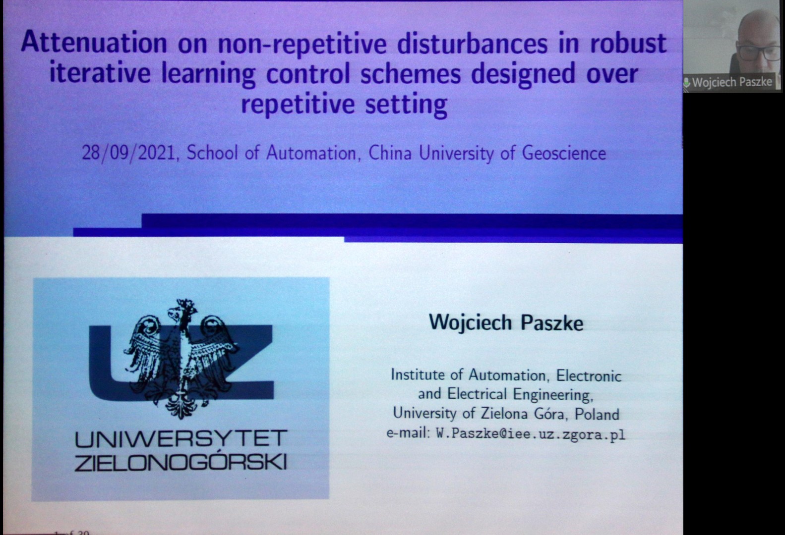 开幕式后,北京师范大学-香港浸会大学联合国际学院王庆国教授在线上为师生作了题为《Control Design with Guaranteed Transient Performance: An Approach with Polyhedral Target Tubes》的学术报告,波兰绿山大学Wojciech Paszke副教授作了题为《Attenuation on Non-Repetitive Disturbances in Robust Iterative Learning Control Schemes Designed Over Repetitive Setting》的学术报告。