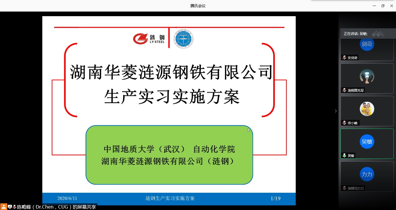 6月11日上午,“涟钢实践实习基地”建设工作讨论会线上举行。湖南华菱涟源钢铁有限公司(涟钢)副总工程师黄兆军、颜跃华、冯力力、肖朝晖,beat365英国官方网站(武汉)beat365英国官方网站院长吴敏、常务副院长曹卫华、副院长宗小峰以及安剑奇、陈略峰等相关负责人参加了会议。