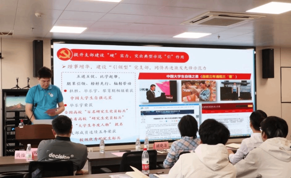 在党建经验分享环节中,博一党支部书记闻博昱从支部组织形式、支部优秀典型、支部特色党组织活动、党建工作数字化赋能等方面介绍了支部围绕“五型研究党支部”建设目标所做工作和突出成果。重点汇报了支部依托“新工科”专业特色,发挥“党建+新一代信息技术”的理念,打造“青春向党”智慧系统的研发历程和系统特色功能。闻博昱指出,“青春党建”系统围绕新时代高校党建“双创”工作重点任务指南中的“七个有力”设计框架,包含党员“生命轴”、信息“高速路”和共享“学习网”三大特色功能。目前,该系统已服务校内外15个党支部、300余名党员,在党员发展、党员信息统计和主题党日活动开展等方面发挥了重要作用。参会领导老师对博一党支部“党建工作数字化赋能”的工作产生浓厚兴趣,并进行了深入交流和讨论。