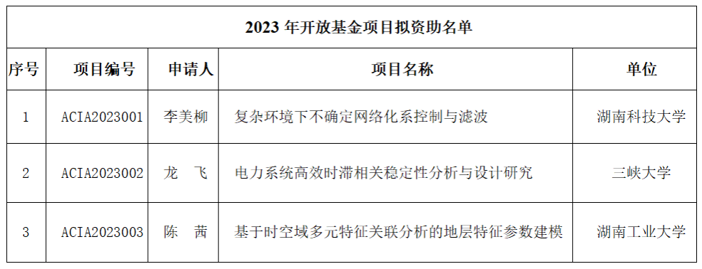 根据《复杂系统先进控制与智能自动化湖北省重点实验室、地球探测智能化技术教育部工程研究中心、教育部复杂系统先进控制与智能自动化学科创新引智基地2023开放基金项目申请指南》和开放基金项目申请通知,按照“公平竞争,交叉融合”的原则,对申报的3项开放基金项目申请书进行了专家审议,拟资助 “复杂环境下不确定网络化系控制与滤波”等3个项目为2023年开放基金项目,现予以公示。公示时间:20231222日至20231228日。公示期间,如对项目资助有异议,请以书面形式反馈学院办公室。
