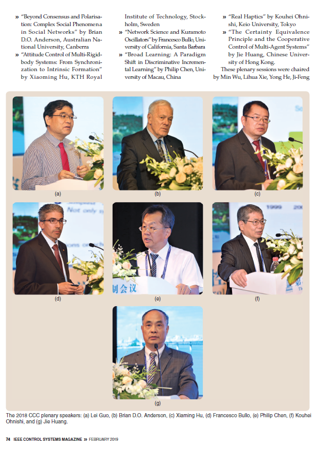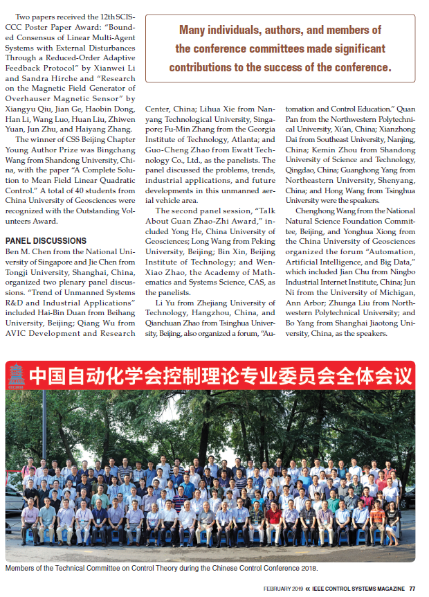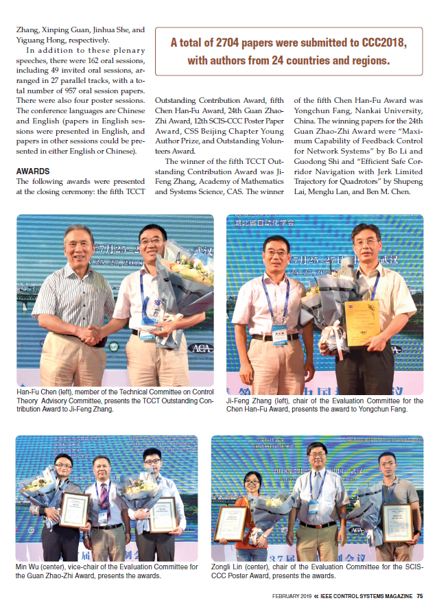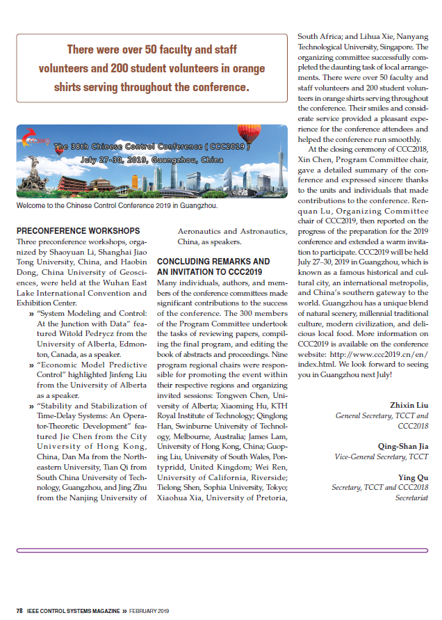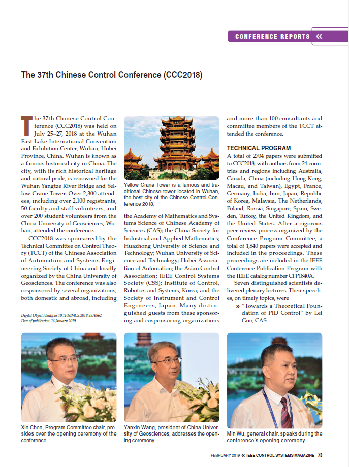 2018年7月25日至27日,由beat365官网承办的第37届中国控制会议(CCC2018)获得圆满成功。本次会议受到国际学界关注,国际知名期刊《IEEE Control Systems Magazine》对会议作了大篇幅报道。
