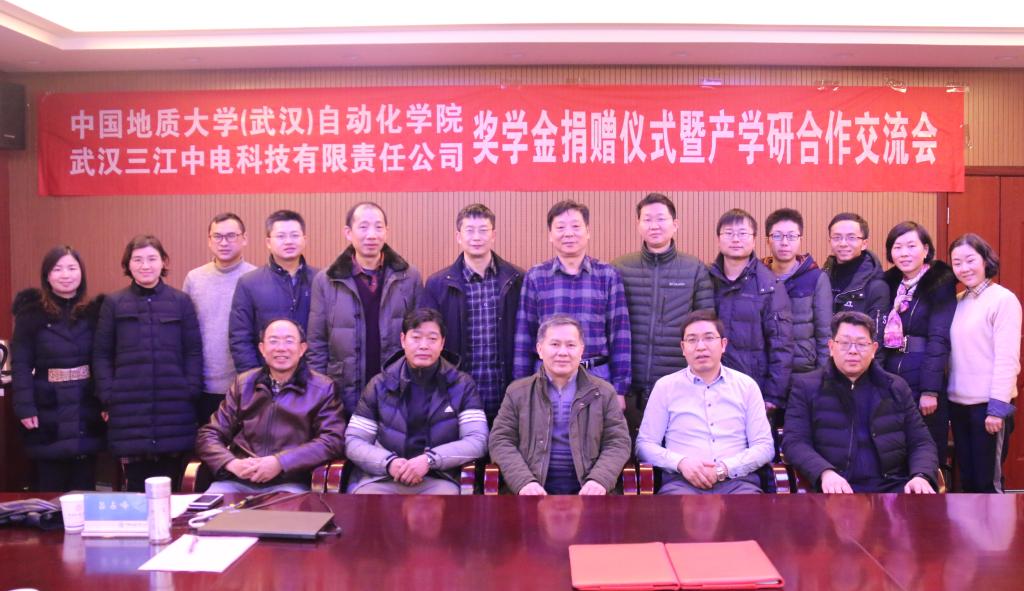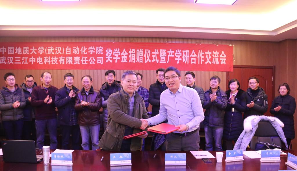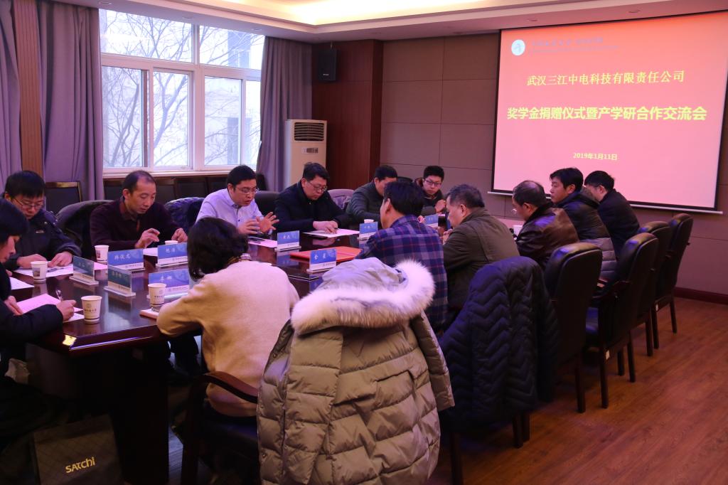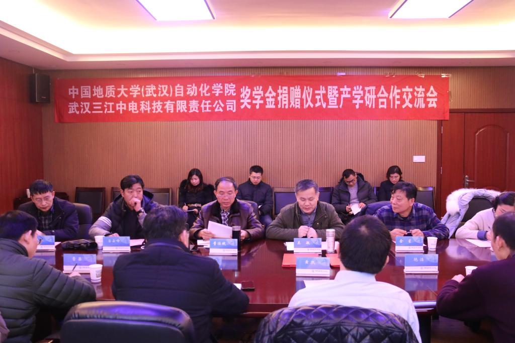 1月11日,武汉三江中电科技有限责任公司奖学金捐赠仪式暨产学研合作交流会在beat365官网会议室举行。武汉三江中电科技有限责任公司董事长黄凯、总经理叶鹏一行9人,我校校友工作与教育基金管理处副处长吕占峰,beat365官网院长吴敏、党委书记董浩斌、副院长金星、曹卫华等院领导和相关教师出席了捐赠仪式。副院长金星主持仪式。