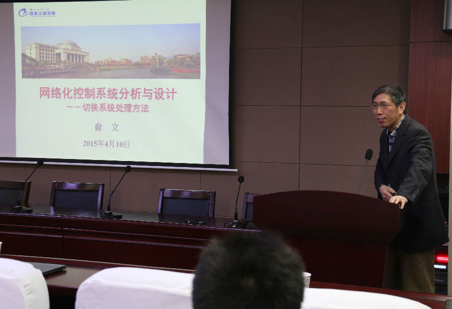 俞立教授的学术报告题为 “网络化控制系统的切换系统处理方法” 。他针对网络化控制系统中的时延和丢包等问题及其特性, 介绍了基于切换系统处理方法的网络化控制系统建模、分析和设计问题,如何通过分析时延和丢包特性,用一个由多个子系统组成的切换系统来描述网络化系统的方法,以及如何利用各子系统上的驻留时间来分析系统的稳定性等性能的问题。