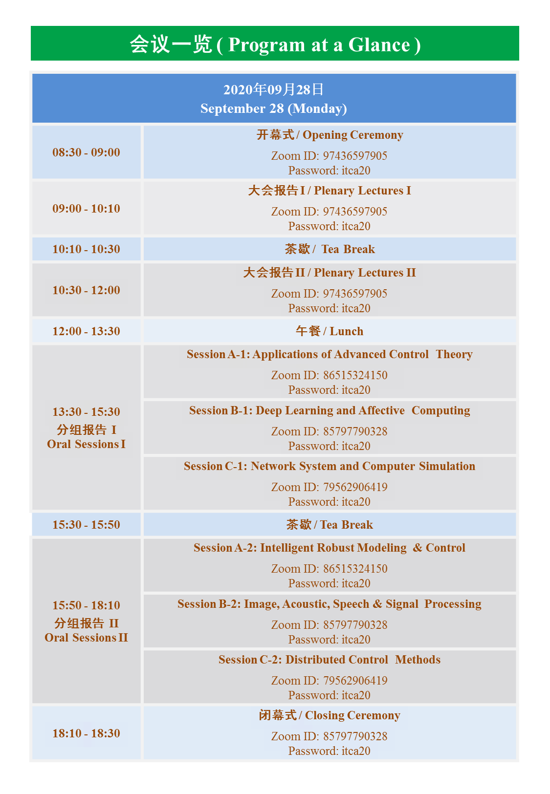 第13届中日信息技术与控制应用国际研讨会(ITCA2020)由beat365英国官方网站(武汉)、湖北民族大学承办,将于2020928Zoom线上会议形式举行。会议日程及Zoom ID等信息如下: