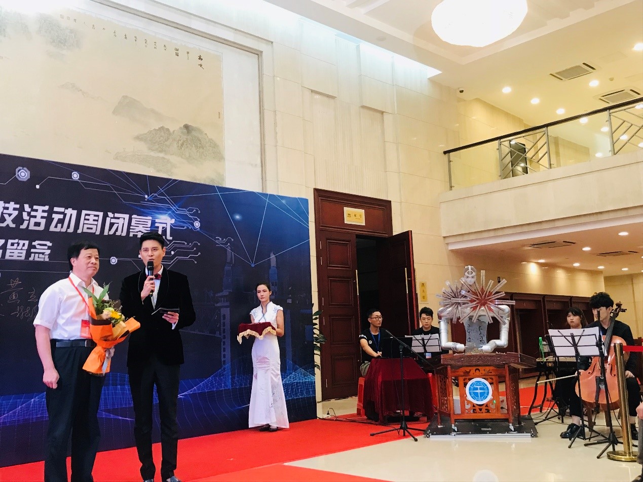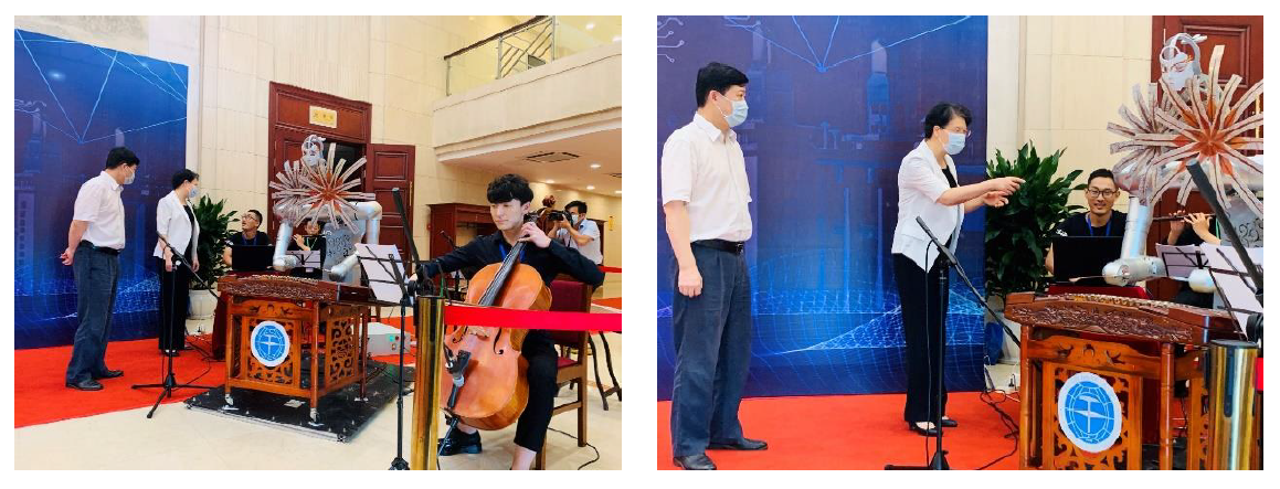 2020年全国科技活动周闭幕式是疫后湖北省承接的第一个全国性大型活动,海百合音乐机器人在闭幕式上,与乐队圆满完成近40分钟的人机交互演奏,受到了参会嘉宾的关注和赞誉。湖北省副省长肖菊华、省科技厅厅长王炜驻足观看演奏,并与团队成员进行了亲切的沟通和交流。