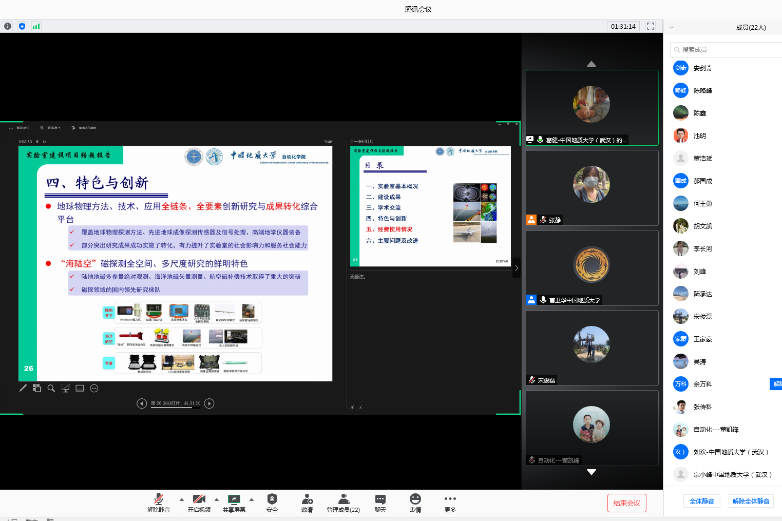 余志华、陆承达、李勇波、葛健分别汇报了光电技术与仪器实验室、钻进过程控制与地质装备智能化实验室、系统集成及工业机器人实验室和智能地球探测仪器与信息处理实验室的建设情况、研究进展、研究成果,以及实验室建设项目的任务完成情况。郝国成、宋俊磊、王家豪、余万科分别作了省重点实验室2018年批准的开放基金项目的结题汇报。科研秘书张静就2019年批准的三项开放基金项目的中期研究进展情况进行了简要介绍。