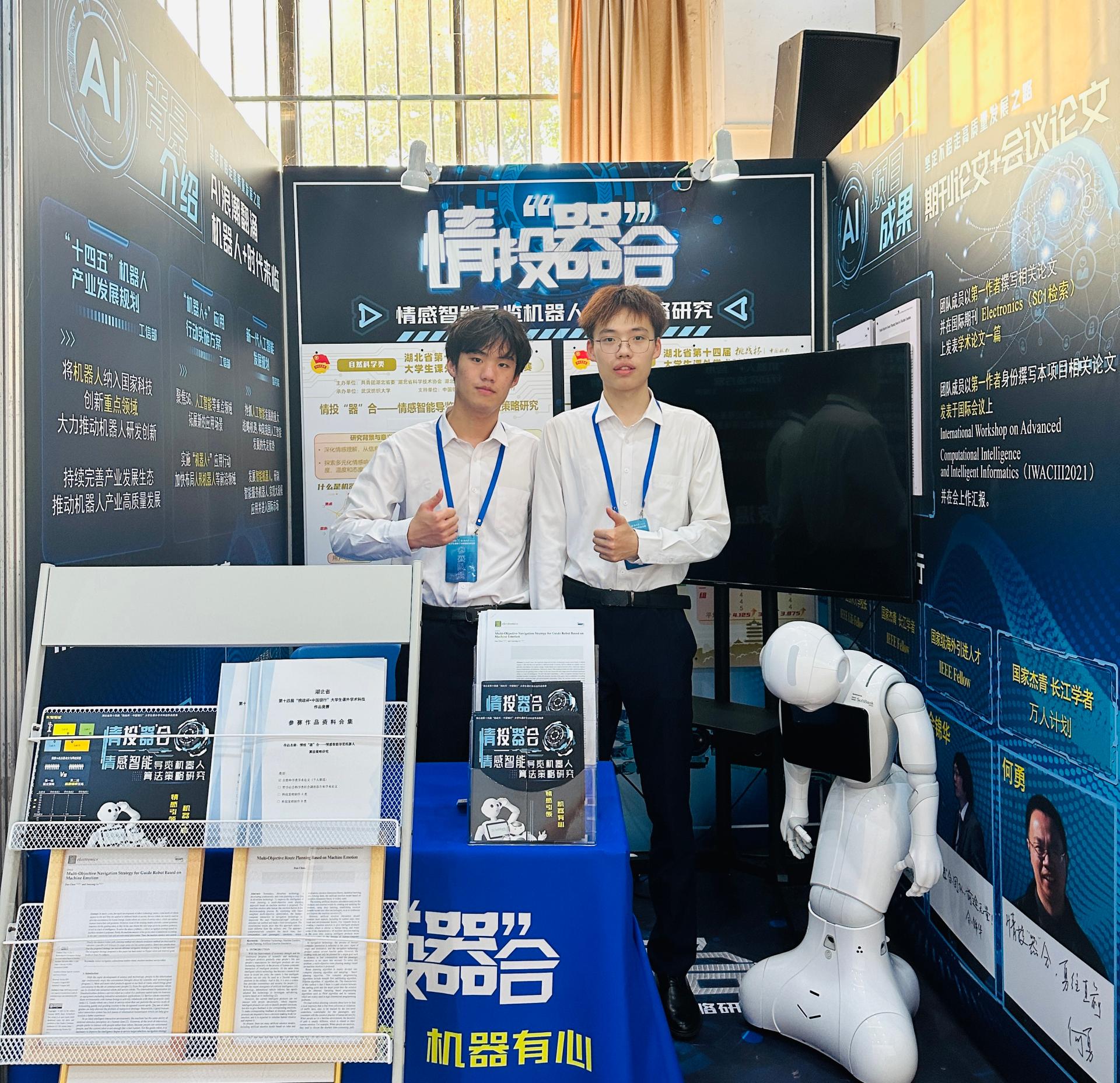 《情投“器”合——情感智能导览机器人算法策略研究》项目由刘振焘教授、川田誠一教授和王艺霖老师共同指导,团队由beat365官网本科生陈聃、未来技术学院本科生葛云聪组成,荣获省赛二等奖。该项目提出基于机器情感的人机交互策略,并以导览机器人为研究对象,在实际场景中进行理论方法部署与验证,探索更多元化的人机情感交互。
