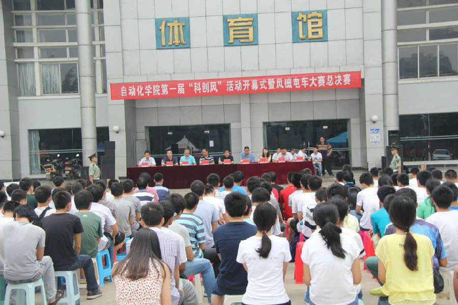 2015年5月28日下午三点,beat365英国官方网站第一届“科创风”系列活动之风磁电车大赛总决赛在体育馆门口顺利进行,副校长赖旭龙、教务处副处长王兴、学工处副处长马彦周、校团委副书记胡肖、学院党委书记董浩斌、学院副院长曹卫华、学院副书记何建新、大学生创新创业中心副主任张华、学院团委书记谭文伦参加了此次活动。