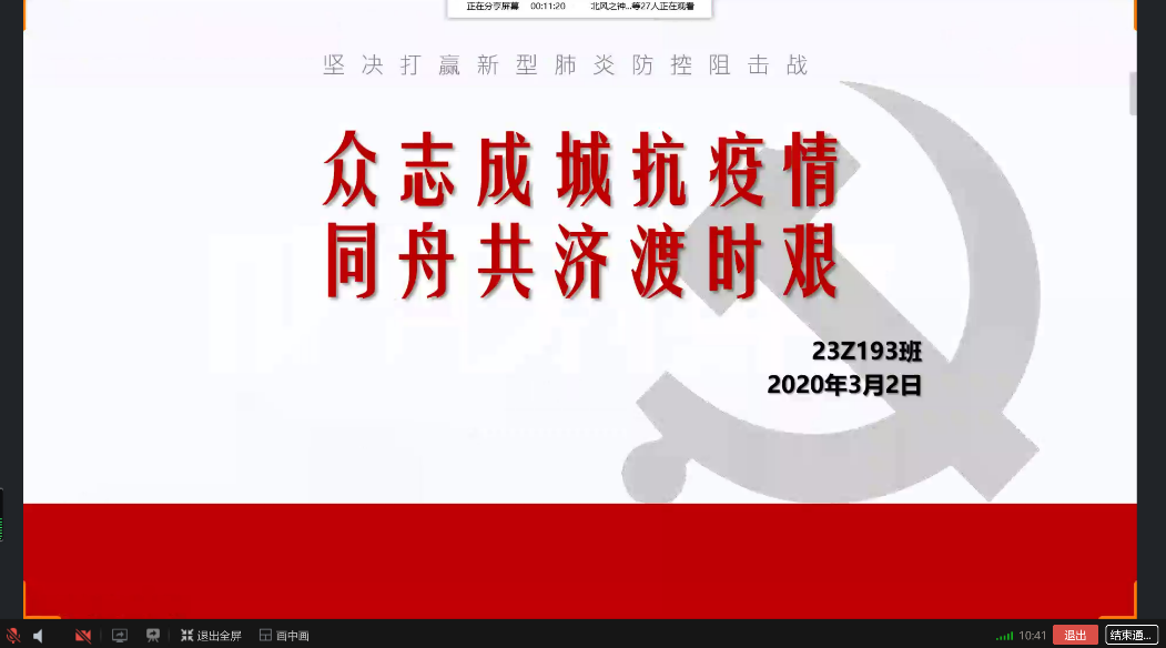23Z193班3月2日组织召开“众志成城抗疫情,同舟共济渡时艰”线上主题班会,班长姜鸣宇主持本次班会,全体同学参加了会议。