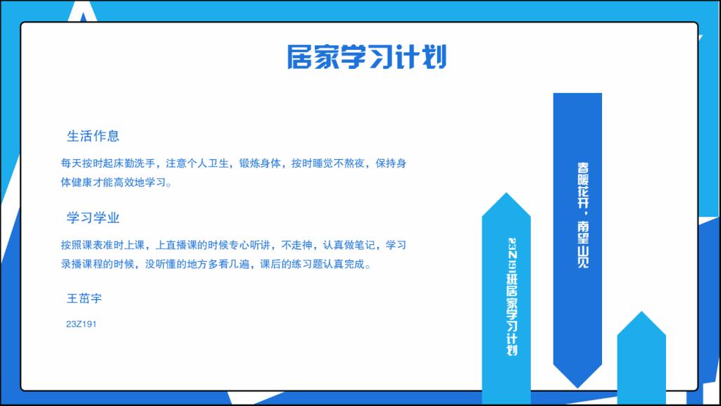 23Z191班3月1日召开本学期第一次会议-“同心抗疫,共克时艰”主题班会,班长肖纬琦同学主持会议。本次会议由四个部分组成,一是“共克时艰,抗击疫情”,二是“热爱祖国,乐于奉献”,三是“停课不停学”,四是“保持乐观,健康生活”。