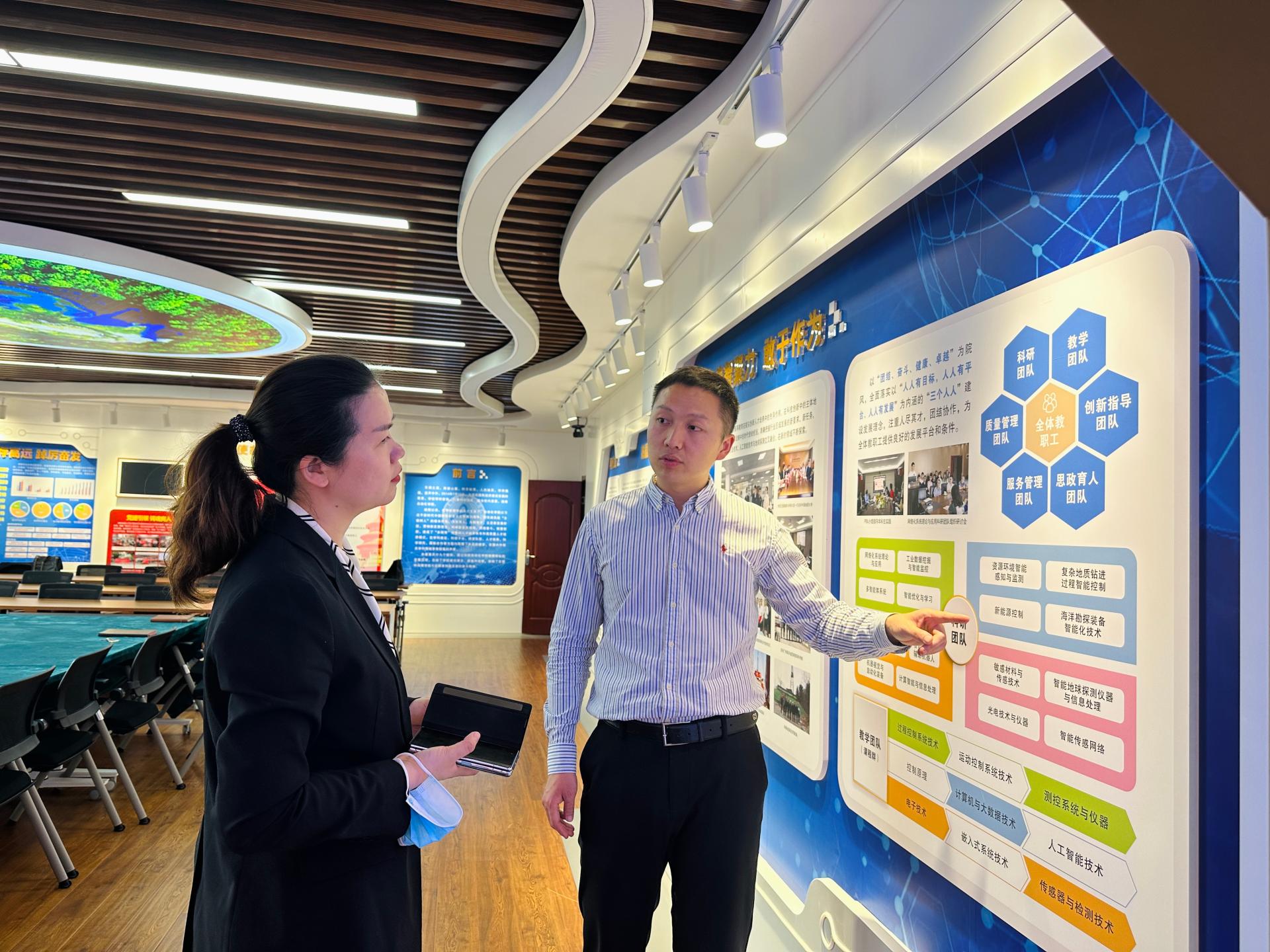会前,龚丽一行参观了教三楼机器人创新实验室、青创空间等场域。王向东着重介绍了学院在创新创业教育方面的探索与实践,在2022年成立创新创业工作领导小组,多方整合校内外资源,为学生参加双创竞赛多维赋能,注重实践教学环节与创新竞赛相结合。